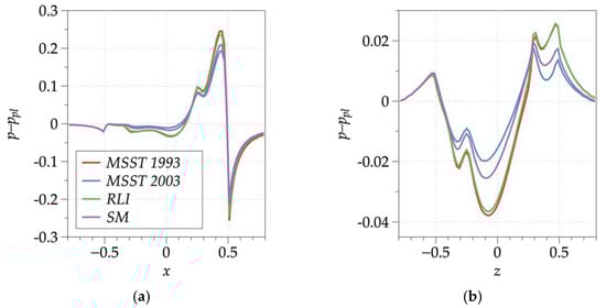 In Figure 6a,b, the pressure drop is determined in the projections of the dimpled wall points onto the control plane, coinciding with the dimpled heated flat wall of the channel, and at the appropriate points of the plane-parallel channel. As already mentioned in the analysis of the pressure fields on the dimpled wall of the channel, the maximum pressure is seen in the vicinity of the windward edge of the dimple. The static pressure drop in the middle longitudinal section is also observed on the rounded surface of the dimple edge, achieving a value of 0.25. A sharp pressure drop to a value of approx. −0.25 is seen behind the dimple edge at the place of curvature discontinuity. On the windward side, decreases rather quickly when it moves away from the edge and somewhat increases near the bottom, up to a value of 0.1. While approaching the dimple center on the windward side, the pressure drop takes a value of −0.04 at the flat bottom, i.e., a slight rarefaction is observed in the dimple center. A small negative pressure drop close to a constant one is maintained on the bottom part adjacent to the leeward slope of the dimple, and on the slope itself, it is close to zero. A small static pressure drop up to a value of −0.02 is seen in the vicinity of the leading edge of the dimple. Generally, the pressure drop predictions obtained with the use of different SST models in the middle longitudinal section are close enough. Slight differences can be seen in the center of the dimple and at its trailing edge. The rarefaction and maximum stagnation pressure levels, predicted with the use of the Menter 2003 SST model and the Menter 2003 SST model corrected according to SM, appear to be underestimated. The changes in the predictions obtained by the different SST models for the pressure drop in the middle transverse section of the dimple appear to be quite visible in the background of the not-too-significant extreme values from −0.038 to 0.025. The differences are especially big in the dimple center. They reach a value of 0.02, which is almost 100% of the minimum pressure drop value determined by the Menter 2003 SST model. Thus, we should emphasize a good quantitative agreement of the predictions, obtained by the Menter 1993 SST model and the Menter 2003 SST model corrected according to RLI, and a significant deviation from the predictions, obtained by the Menter 2003 model incorporated into the widely used software CFX, Fluent, StarCCM+, OpenFOAM, etc., and from those obtained by this model corrected according to SM.