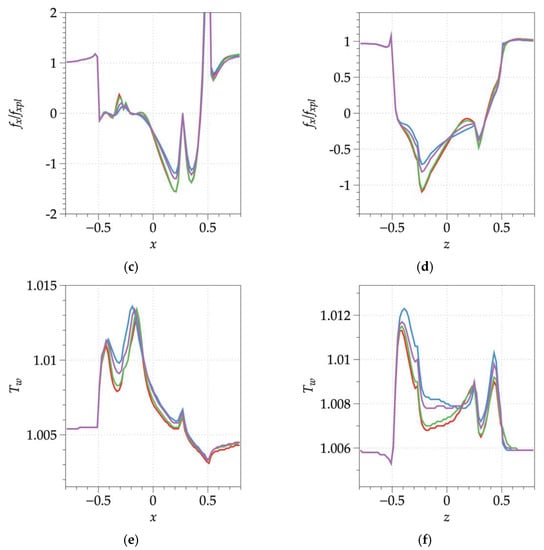 Distributions of the static pressure drop (a,b), the relative friction (c,d), and the temperature (e,f) in the middle longitudinal (a,c,e) and transverse (b,d,f) sections of the dimpled wall of the channel for the different standard SST models and the modified Menter SST models. Red line—Menter 1993 SST model, Blue line—Menter 2003 SST model, Green line—Menter SST model corrected according to RLI, and Purple line—Menter SST model corrected according to SM.
