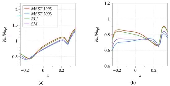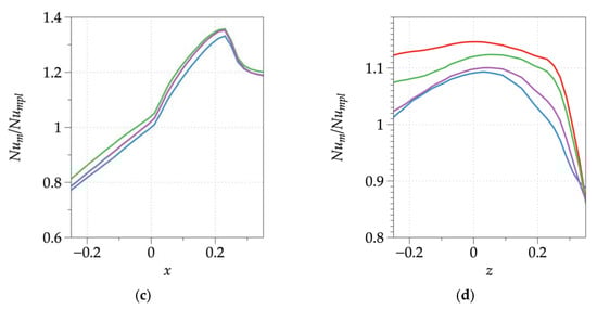 Figure 7 illustrates the calculation relations of the relative local Nusselt numbers and the transverse strip-integrated Nusselt numbers along the x- and transverse z-coordinates in the middle section of the control area of the heated wall with a conical dimple for the different SST turbulence models.