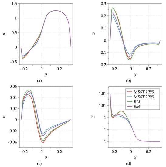 Figure 8 compares the calculated profiles of the Cartesian velocity components of the separated flow, temperature, and turbulence characteristics in the conical dimple center obtained with the use of different SST models. The predicted values of are typical for separated flows in deep dimples [72,76]. The maximum backflow velocity reaches a value of 0.4. The prediction obtained with the use of the Menter 2003 SST model and the Menter 2003 SST model corrected according to SM somewhat underestimates this value (up to 0.3). In the channel flow core, all models yield the same profiles. The velocity profiles of the secondary swirling flow are different for the different SST models. The maximum value of the positive velocity near the wall is 0.27, and the minimum value of in the shear layer is −0.15. In the channel flow core, approximately the same velocity is maintained, showing that the right–left shear flow is formed under the dimple. The use of the Menter 2003 SST model and the Menter 2003 SST model corrected according to SM underestimates the secondary flow intensity. decreases up to 0.2 and increases up to −0.11. Thus, the maximum deviation of is 30%. The profiles of the vertical velocity show that a rather weak ascending flow with a maximum velocity of 0.055 is formed near the dimple bottom. This flow meets the descending flow at the maximum intensity in the shear layer of the order of . Above the dimple in the flow core, the vertical velocity component is negative and decreases linearly while approaching the upper wall. The use of the Menter 2003 SST model and the Menter 2003 SST model corrected according to SM underestimates the intensity of the ascending and descending flows. The maximum deviation of the predictions of does not exceed 0.01, which is 20–25% of the extreme value of .