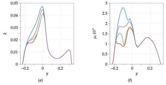 Profiles of the longitudinal (a), transverse (b), and vertical (c) Cartesian velocity components; temperature (d); turbulence energy (e); and vortex viscosity (f) at the central point of the conical dimples for the different standard SST models and the modified Menter SST models. Red line—Menter 1993 SST model, Blue line—Menter 2003 SST model, Green line—Menter SST model corrected according to RLI, and Purple line—Menter SST model corrected according to SM.