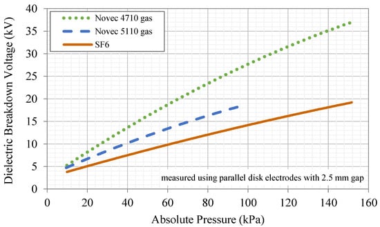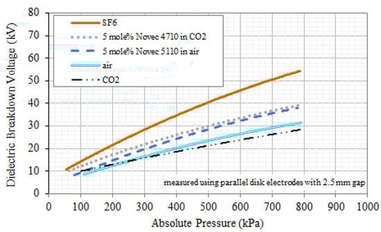 Dielectric breakdown voltage of gas mixtures compared to pure SF6.