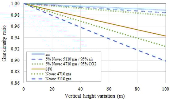 Due to their higher boiling points and corresponding lower vapor pressures, the Novec gases are used in gaseous mixtures rather than as pure materials. Dilution in gaseous mixtures allows the equipment to operate at temperatures well below the boiling points of these materials without condensation. Once gases form a homogeneous mixture, they do not physically separate unless liquefied by cooling below the condensation temperature or compressed to very high pressures. Similarly, although gas density will vary with height in a vertical column, the mixture does not separate over time with the higher molecular weight components concentrating at lower elevations. Figure 2 shows the change in gas density as a function of height in a column of gas for several gases. The pressure exerted by the column of gas above any point creates a greater density compared to higher elevations. Thus, the density of a gas decreases at higher elevations. Larger variations occur as the molecular weight of the gas increases since the greater mass produces higher pressures at the lower elevations. However, the concentrations of individual components in a gas mixture do not change with height. The pressure exerted by the column of gas mixture above a molecule of any component is the same, resulting from the density of the gas mixture above it rather than any individual pure gas. As a result, all components of a mixture are exposed to the same gravitational force and pressure. Therefore, no driving force is created to cause a separation. A similar conclusion was reached in the 1982 EPRI Report EL-2620 []: “In the absence of condensation, a gas mixture will not separate into its component gases over a short or long period of time even when the molecular weights of the component gases are markedly different.” Accordingly, gas separation has not been observed experimentally [,,]. For example, a gas mixture containing Novec 4710 gas and CO2 was stored in a 2-m vertical tube at −15 °C for 6 months with no change in composition detected over the height of the tube [].