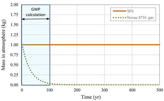 Another disadvantage to assessing the climate impact of gases solely through comparison of GWP values is the inherent limitations within the GWP calculation itself. It is important to note that the commonly recognized GWP for a substance is calculated over a 100-year ITH. This ITH is a compromise between shorter-term and longer-term effects []. However, this means that the full climate impact of a very long-lived gas, such as SF6, is not fully accounted for in the GWP calculation. Figure 5 displays a plot of the quantity of gas remaining in the atmosphere following a 1 kg release. A compound such as Novec 4710 gas with an atmospheric lifetime of 30 years is expected to be essentially fully degraded within the GWP calculation timeframe. Contrast that with SF6 which, due to its atmospheric lifetime of 3200 years, remains in the atmosphere far longer than the 100-year ITH. As a result, only a fraction of its potential impact on climate change is included in the GWP calculation.