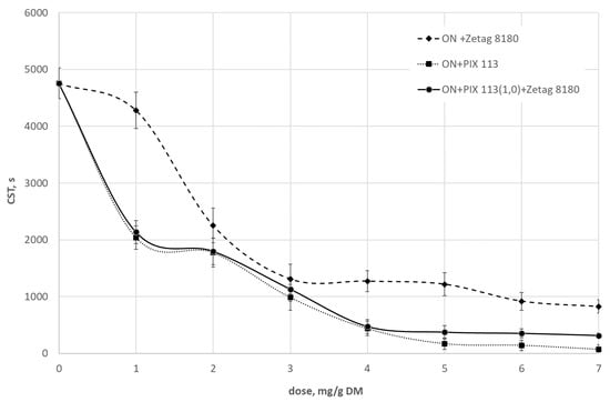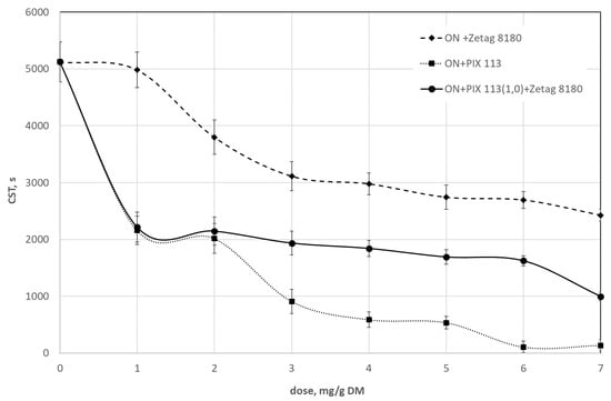 The conditioning of the sonicated sludge with Zetag 8180 and PIX 113 independently or using both chemical reagents simultaneously showed an improvement in sludge dewatering, which is confirmed by the results of the capillary suction time (CST) test. The decrease in CST of the sonicated sludge (A1 = 15.25 μm) prepared with Zetag 8180, PIX 113 and with both reagents together was respectively: 82.7%; 98.5% and 93.4% (Figure 1). The smallest CST value was obtained for the sonicated sludge prepared with PIX 113 at the highest dose of 7.0 mg/g DM. On the other hand, for sludge sonicated with A2 = 45.75 μm, the reduction in CST for selected chemicals was respectively: 52.6%; 97.3% and 80.6% (Figure 2). The smallest CST occurred again when sonicated sludge was prepared with PIX 113 at a highest tested dose of 7.0 mg/g DM.
