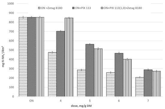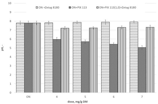 The filtrate after dewatering of sonicated sludge (A1 = 15.25 µm) was characterized by the following parameters: pH = 7.8; concentration of ammoniacal nitrogen—853 mgN-NH4+/dm3, phosphates—215.2 mgPO43–/dm3 and organic compounds marked as COD—3679.2 mgO2/dm3. Conditioning of sludge with PIX 113 caused a decrease in pH (Figure 7) along with an increase dose of coagulant. When polyelectrolyte Zetag 8180 was used, an increase in pH was observed.