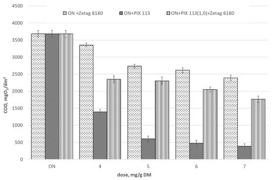 The concentration of organic compounds expressed as COD in filtrate after dewatering of prepared sludge is given in Figure 8. The highest value of COD was observed for sonicated sludge. Conditioning of sludge with chemical reagents caused a decrease in COD. The best quality of filtrate after dewatering was obtained for sludge prepared with PIX 113. The highest efficiency of organic compound removal was achieved when PIX 113 was used in a dose of 7.0 mg/g DM. Then the lowest COD value was 386.4 mgO2/dm3, and COD was reduced by 89.5%. Conditioning of sludge with chemical reagents caused a decrease in phosphates and ammonium nitrogen in filtrate after dewatering (Figure 9 and Figure 10). The lowest phosphate value of 6.2 mg P-PO43−/dm3 was observed for the same sample, when PIX 113 was used at the dose of 7.0 mg/g DM. The phosphate concentration was reduced then by 97.1%. On the other hand, the lowest value of ammoniacal nitrogen was obtained in filtrate for the samples of sludge prepared with Zetag 8180. The lowest concentration of ammoniacal nitrogen (206 mg N-NH4+/dm3) was observed at the dose of 7.0 mg/g DM. The reduction of N-NH4+/dm3 was 75.8%.
