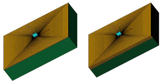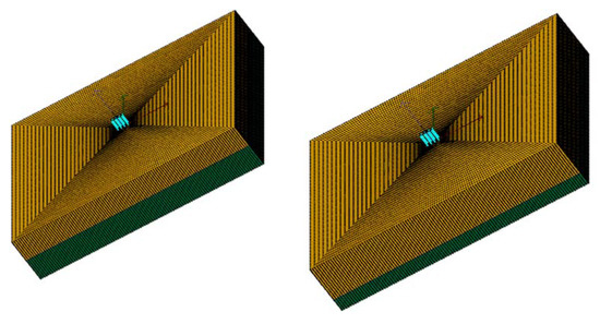 Numerical simulations were performed with OpenSeesPL (an open-source computational platform) [18], by the Pacific Earthquake Engineering Research (PEER) centre. In particular, the Opensees PL platform, developed by the authors of [19] at University of California, San Diego, was applied to model the different case studies. Tridimensional soil meshes were described with BrickUP isoparametric elements. These elements allow to consider both the displacements (longitudinal, transversal and vertical: degree of freedom: 1, 2 and 3, respectively) to simulate the dynamic response of the soil. One 3D mesh for every considered configuration (total: 4, as shown in Figure 1) has been implemented to model a building resting on a sandy soil domain. What changes between the 4 3D meshes is the location of GSI that is located between the first (yellow) layer and the second (green) layer that have the same the same properties. The dimensions of the elements inside the mesh followed the previous contributions [1,17]. Furthermore, the performance of the lateral boundaries was verified by comparing the accelerations at the top of the mesh with those obtained under the free field (FF) conditions to reproduce wave mechanisms. Mesh discretization was derived considering a 100 m/s as the lowest shear wave velocity and a 10 Hz as the maximum frequency.