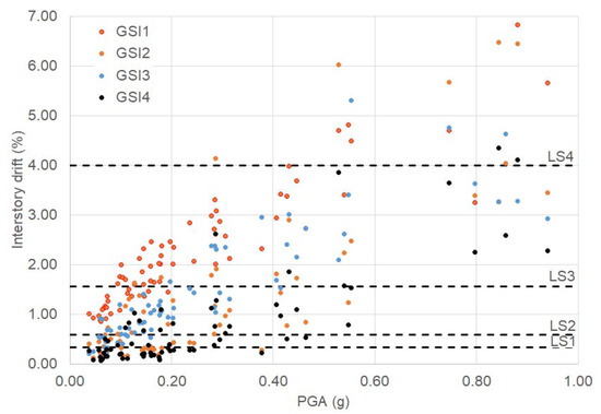 PGA vs. interstory drifts for GSI1, GSI2, GSI3 and GSI4.