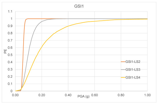 Fragility curve for GSI1: PGA vs. Probability of Exceedance (PE).