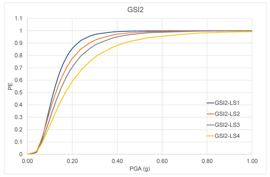 Fragility curve for GSI2: PGA vs. Probability of Exceedance (PE).