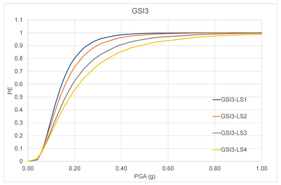 Fragility curve for GSI3: PGA vs. Probability of Exceedance (PE).