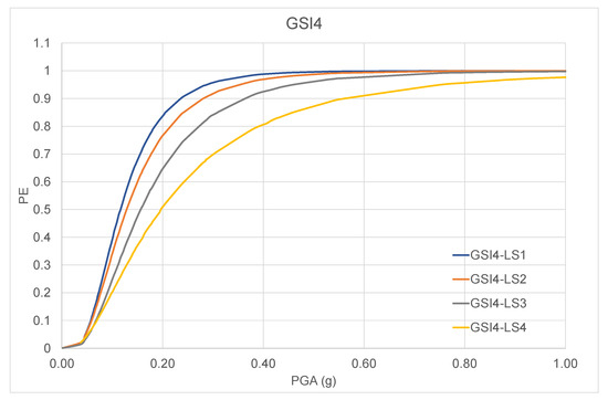 Fragility curve for GSI4: PGA vs. Probability of Exceedance (PE).