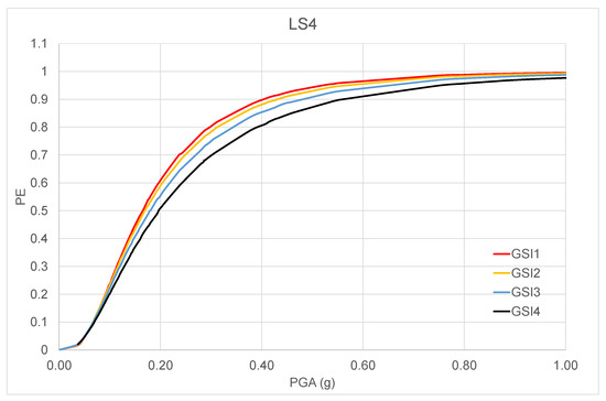 Comparison: fragility curve for GSI1-4, LS4 (drift: 4%): PGA vs. Probability of Exceedance (PE).