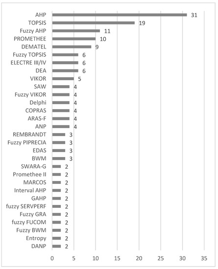 Data on multi-criteria decision-making methods were summarized to obtain a database from 2000 to 2021 (Appendix B). Figure 1 shows the methods that have been used in at least two studies over the past 20 years.
