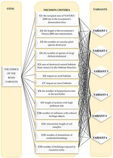 As part of this multi-criteria analysis, six different variants of the road route and 13 decision-making factors reflecting the impact of this investment on the environment and society at large were considered. The criteria for the evaluation of variants are each time individually selected depending on the nature and subject of the analysis. The decision criteria in this case study were adopted from the environmental impact report [75]. The hierarchical structure of the decision problem under consideration is shown in Figure 3.