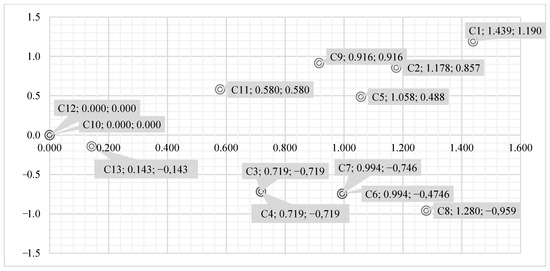 The elements of the n matrix represent both direct and indirect relations between decision factors. The final stage in the DEMATEL method is the calculation of two key indicators, the so-called significance index and relation index. Based on their values, the final cause-and-effect diagram is created, illustrating both the activity of the decision factors and their nature in the created cause–effect chain. The factors with positive values of the relation index are causal, i.e., they have the most significant impact on the remaining elements in the data set under consideration. Conversely, factors with negative values of the dependency index affect the created cause–effect chain.