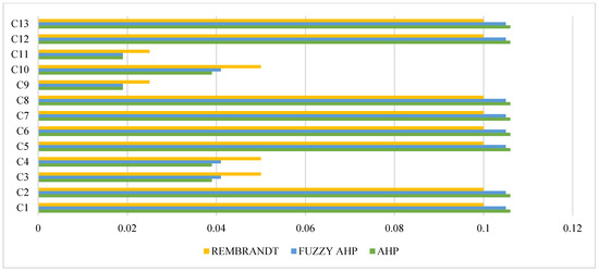 Figure 5 presents individual decision factors’ weights estimated using the following methods: AHP, Fuzzy AHP [1], and REMBRANDT. It should be emphasized that the starting point for the calculations was the AHP comparison matrix evaluations, which were then transformed according to the algorithm of the other two methods.