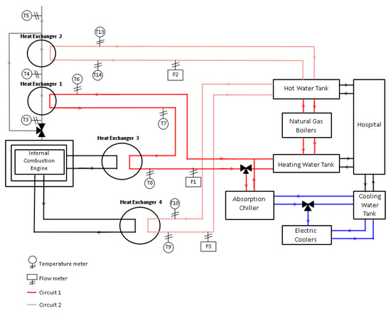A flow meter (4–20 mA flow meter) is installed in each of the three circuits, and temperature sensors (PT100 for water and air sensors and TYPE-K thermocouple for gas sensors) measure the water temperature in the input and output of every heat exchanger. Flow switches are also installed to supervise the water flow. Temperature and water flow measurements are recorded every minute by a SCADA monitoring system. The meters necessary for the proceeding energy flow analysis are displayed in Figure 1.