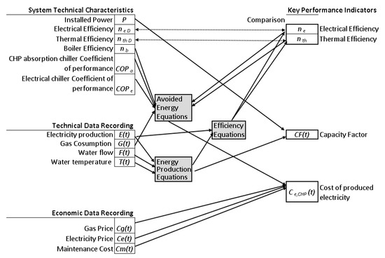 Energy flows, generated electricity, and recovered heat are calculated based on measurements recorded by a SCADA monitoring system. Hourly natural gas consumptions are monitored by the Gas Distribution Company. Energy prices are selected through invoices from utility companies.