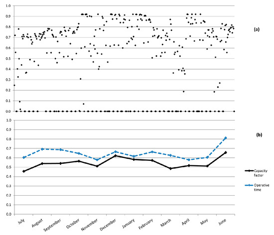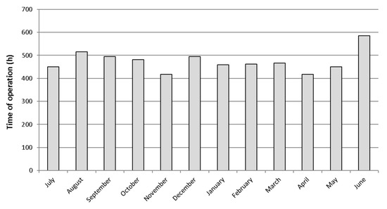 In Figure 4, the monthly total time of operation is presented. It is apparent that the CHP is not in constant operation, with the operating schedule covering 65% of the total examined period. The operating hours during the examined period are scheduled from Monday at 07:00 until Friday at 23:00.