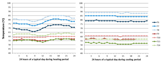 Hourly fluctuation of monitored temperatures for one typical day of the heating period and one of the cooling period.