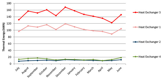 The monthly values of recovered heat in each heat exchanger are presented in Figure 6. Values are higher in circuit 1, including heat exchangers 1 and 3, designated for space heating. However, heat recovery in circuit 1 decreases after December (2015), and especially during the cooling period of 2016. The system should be designed to give priority to the CHP.