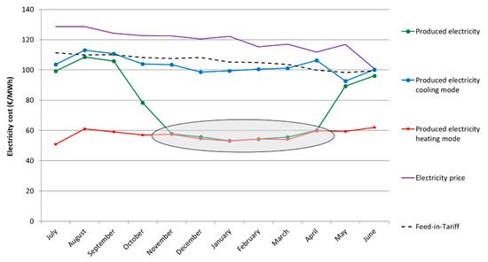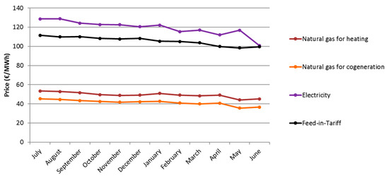 The monthly average values of all economic parameters are presented in Figure 7. In June (2016), the purchased electricity values are affected by the hospital’s decision to switch to a different provider company. The feed-in tariff (FiT) applied by the Greek authorities to support CHP are also presented to economically analyze this scenario as well, although the energy is not sold to the grid. The FiT, according to the Greek legislation, is calculated monthly as a function of the average gas price to eliminate a gas volatility risk.