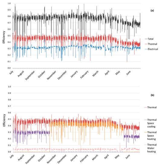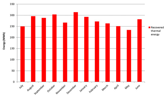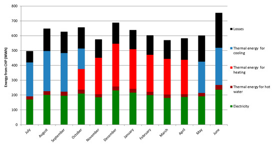 Figure 8 presents the monthly gas consumption of the CHP and the monthly energy balance. The recovered heat is used for space heating or space cooling, and for water heating. More specifically, the recovered heat from circuits 2 and 3 is used for water heating, while the recovered heat from circuit 1 is used for space heating during the heating period (15 October–April) and for space cooling during the cooling period (15 October–May), when the thermal energy from circuit 1 is transferred to the absorption chiller through the triode valve. Useful heat production is higher during winter months, while monthly energy production for water heating is quite stable, both following the load. Energy losses are estimated as the remaining energy from the fuel energy.
