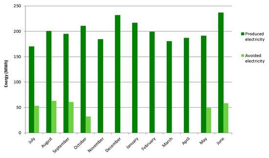 Monthly electricity production from CHP and monthly avoided electricity consumption.