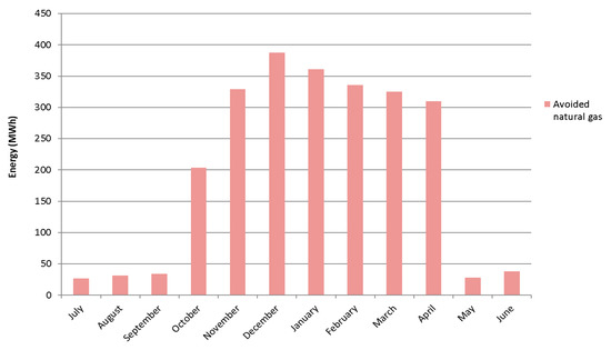 Figure 10 presents the recovered heat from CHP and Figure 11 presents the monthly avoided natural gas consumption. The recovered thermal energy is the total recovered heat , while the avoided natural gas consumption corresponds to the amount of substituted thermal energy from the conventional heating system. As expected, avoided thermal energy is higher during winter when heating energy needs and energy production from CHP are higher.