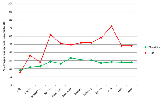 According to the percentage of energy needs coverage by CHP, as presented in Figure 12, the cogenerated heat covers about 50% of the hospital needs. However, during the cooling period, the load coverage is low, 25% on average.
