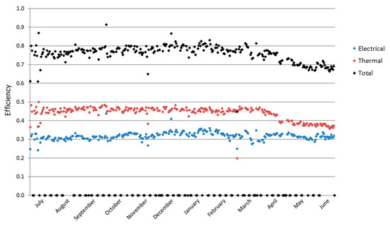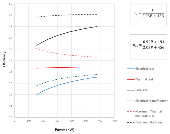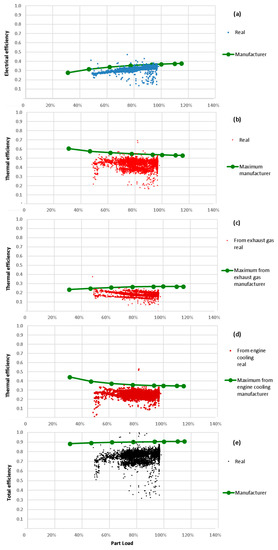 Overall, the CHP system achieves satisfactory performance in terms of electricity production, showing efficiency results that are close to those presented by the manufacturer. This result is safe and accurate based on energy providers’ data, in situ measurements, SCADA measurements, and energy balance equations. Electrical efficiency is constantly above 30%, and within the design values.