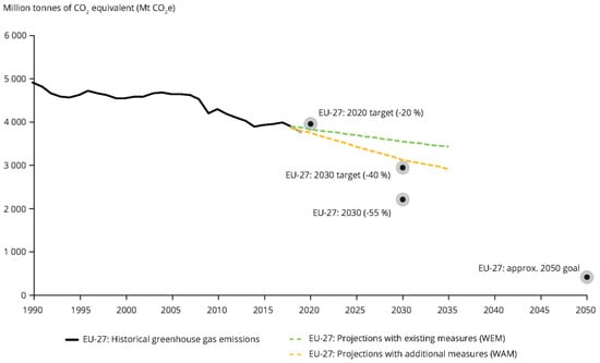 Greenhouse gas emission targets, trends, and Member States’ MMR projections in the EU, 1990–2050. Source: https://www.eea.europa.eu/data-and-maps/indicators/greenhouse-gas-emission-trends-7/assessment (accessed on 5 August 2021).
