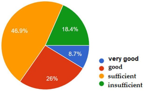 The deliberations on renewable energy sources and, in fact, on the respondents’ knowledge of them began with the question How do you assess your knowledge of renewable energy sources? Only 8.7% of the respondents declared their knowledge in this area to be very good, 26% good, 46.9% sufficient, and 18.4% insufficient (Figure 2 and Table 1).