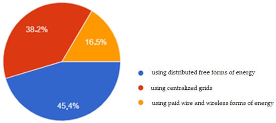 When asked Which energy-saving model would you and your family prefer? The respondents chose the option of using distributed free forms of energy (45.4%), using grid centric free forms of energy (38.2%), and 16.5% favored the model of using paid wired and wired free forms of energy (Figure 3 and Table 8).