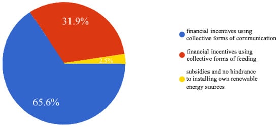 In response to the question Which forms of incentives would you prefer most? 65.6% of the respondents indicated financial incentives using collective forms of communication, 31.9% financial incentives using collective forms of feeding, and 2.5% subsidies and no hindrance to installing one’s own renewable energy sources (Figure 5 and Table 11).