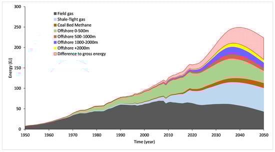 On the basis of each model score (i.e., the total number of criteria met) we chose GlobalShift’s model (although not free, the access cost is rather modest and the publishing policy is not restrictive). For every gas-producing country, their model includes past and projected production from 1950 to 2050, as well as estimates of reserves and wells. Projections are compiled at regional, geopolitical and global scales. GlobalShift differentiates between onshore gas (field gases, Shale/Tight Gases or STGs and Coal Bed Methanes or CBM) and offshore gas (0–500 m, 500–1000 m, 1000–2000 m and 2000+ meters). The production data do not comprise unsold vented, flared, and re-injected gases, as well as gases used on site. For a recent description of GlobalShift Ltd.’s forecast model, see Smith [62] or the GlobalShift website (http://GlobalShift.co.uk/gases.html, accessed on 15 July 2021).