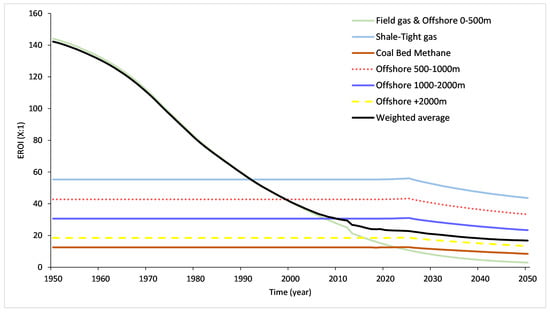 Evolution of the EROI of all gas types, and the weighted average from 1950 to 2050.