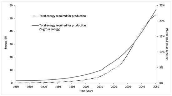 Average gas net-energy production from 1950 to 2050, compared to the gross energy.