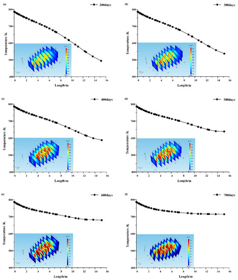 Oil shale reservoir temperature distribution under a gas injection rate of 11 m3/min. (a) Heating for 200 days; (b) Heating for 300 days; (c) Heating for 400 days; (d) Heating for 500 days; (e) Heating for 600 days; (f) Heating for 700 days.