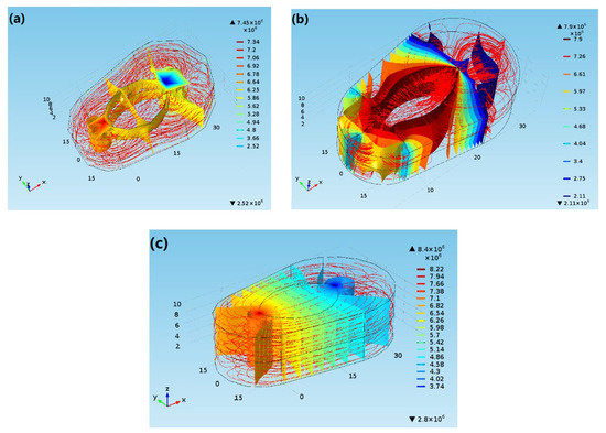 In the early stage of heating, under the action of high-pressure displacement, the fluid mainly flows out from the direction of the oil shale bedding. At this time, the oil shale formation is not completely heated, and the porosity of the primary strata is low. The fluid flows through the mining well along the fracture. Only a few fluids flow out from the primary pores of the oil shale under Darcy seepage, the resistance is high along the way and the outlet pressure is small. As shown in Figure 5, with the increase in oil shale formation temperature, especially the fissure temperature, the porosity increases and the resistance decreases. However, porosity from the fracture to the boundary decreases. Therefore, the seepage field becomes more and more complicated owing to the seepage behavior from fractures in the oil shale. The seepage behavior proceeds from the center of the fracture to the boundary and the outlet of the well. When the oil shale formation is completely thermally pyrolyzed, the porosity of the whole oil shale reservoir increases to 10.89%. The pressure gradient of the seepage field in the whole area becomes uniform, the flow direction is stable and the resistance along the flow further decreases. The pressure field between the high-pressure heat injection well to the low-pressure mining well decreases, and the output pressure of the well is increased; therefore, the displacement effect is enhanced. The pressure gradient between the high-pressure water injection well and low-pressure production well becomes smaller, the pressure field becomes uniform and the output pressure of the well increases, which improves the displacement effect.