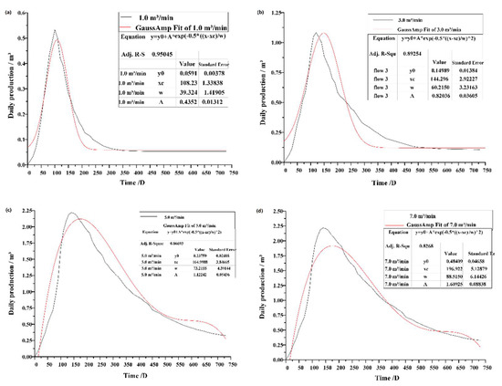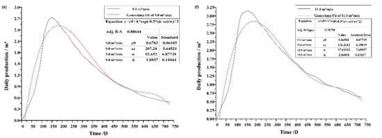 Variation curve of daily output of the mining well under different flow rates. (a) 1.0 m3/min (b) 3.0 m3/min (c) 5.0 m3/min (d) 7.0 m3/min (e) 9.0 m3/min (f) 11.0 m3/min.
