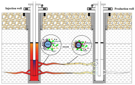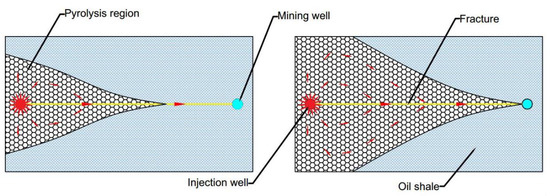 The primary reservoir of oil shale is compact and has low porosity and low permeability. Even though kerogen can be pyrolyzed after heating, the macromolecular organic matter in shale oil produced by the pyrolysis of kerogen cannot be extracted effectively because of the poor conductivity of the stratum, which leads to low effective recovery of oil shale with low oil content under the normal in-situ pyrolysis process [1,2,3]. For the time being, the most effective way to reconstruct unconventional petroleum resources is hydraulic fracturing technology [4]. The technology is also applied in the in-situ pyrolysis of oil shale. It involves using the measure of hydraulic fracturing to create fractures in the oil shale stratum between the heated well and the mining well and pump the fracturing fluid into the fractures with ceramsites to improve the conductivity of the oil shale, increase the effective contact area of the heat transfer medium with oil shale, and increase the heat conduction rate of the oil shale [5,6,7].