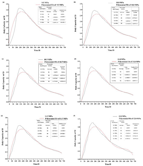 Influence of mining flow pressure on daily productivity. (a) 9.5 MPa (b) 10.0 MPa (c) 10.5 MPa (d) 11.0 MPa (e) 11.5 MPa (f) 12.0 MPa.