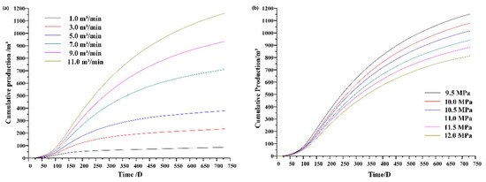 Influence of mining flow rates and pressure on cumulative productivity. (a) Different injection flow (b) Different injection pressure.