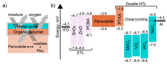 In the present study, the comparison of four metal oxides as inorganic counterparts of double HTL was conducted. In particular, the efficiency and stability were evaluated for PSCs incorporating double HTLs bearing an oxide of one of the four transition metals (Mo, V, W, and Nb), in combination with state-of-the-art polymer polytriarylamine (PTAA) [19]. As mentioned above, such combinations are expected to provide good encapsulation properties preventing the release of volatiles from the photoactive material and additionally protect the photoactive layer from the possible interaction with moisture and oxygen ingress under ambient conditions (Figure 1a).