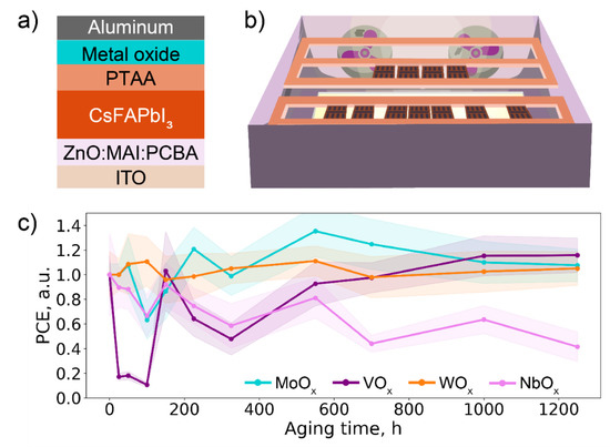 Furthermore, perovskite solar cells incorporating double-layer HTLs with PTAA and MOx with optimized thickness were investigated for stability under continuous light soaking. For this purpose, devices with an ITO electrode were covered with a ZnO ETL passivated with MAI and PCBA. Afterward, a perovskite layer with CsFAPbI3 composition was formed, and the double-layer HTL comprising PTAA was deposited using spin-coating, followed by four MOx with optimized thicknesses being thermally evaporated under reduced pressure. The standard gold and silver electrodes were substituted with aluminum, as such modification allows improvement of the device stability at a cost of slightly reduced efficiency [7], giving the final configuration presented in Figure 3a. According to the literature, such configuration allows achieving high operational stabilities and competitive efficiencies for ZnO-based PSCs [43]. The stability evaluation was performed in the light-soaking chamber’s (Figure 3b) built-in glovebox with an inert atmosphere and control of oxygen and water concentration <0.01 ppm [16]. The unencapsulated devices were exposed to the constant illumination of high-power white light-emitting diodes (70 ± 3 mW/cm2) and a temperature of 45 ± 1 °C for 1250 h, which corresponded to the recommended degradation protocol ISOS-L-2I [44]. During the experiment, the current-voltage characteristics were collected several times; the summarized PCE evolution for devices incorporating metal oxides is presented in Figure 3c.