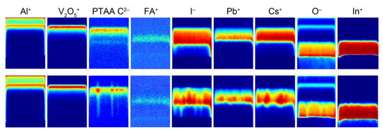 In order to further investigate the encapsulating properties of PTAA/MOx organic–inorganic HTLs, time-of-flight secondary ion mass spectrometry (ToF-SIMS) experiments were conducted on the cross-sections of fresh and aged devices in the described stability experiments. ToF-SIMS is a powerful technique that allows the tracking of changes occurring in the layers of the whole device stack, thus providing insights into the relationship between the cation movement throughout the device and its effect on device stability and efficiency [48]. In this experiment, devices incorporating VOx with the configuration presented previously in Figure 3a were examined. This particular metal oxide was chosen because it exhibited the worst behavior from the stable samples, and the most severe changes in the device composition were expected. In this experiment, the sample was exposed to the focused ion beam directed at a 20° angle in order to obtain the extended cross-section. The emission of secondary ions was registered from the freshly prepared cross-section using a C-TOF detector.