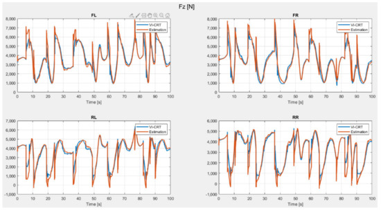 Figure 3, for example, shows some inaccuracy in the tires’ vertical load peak estimation, which is related to the model itself. As it is a steady-state model, damper forces have been neglected, and the tires’ vertical stiffness has been considered as linear. The model is fed mainly by vehicle longitudinal and lateral acceleration, so impacts on curbs are not considered as well.